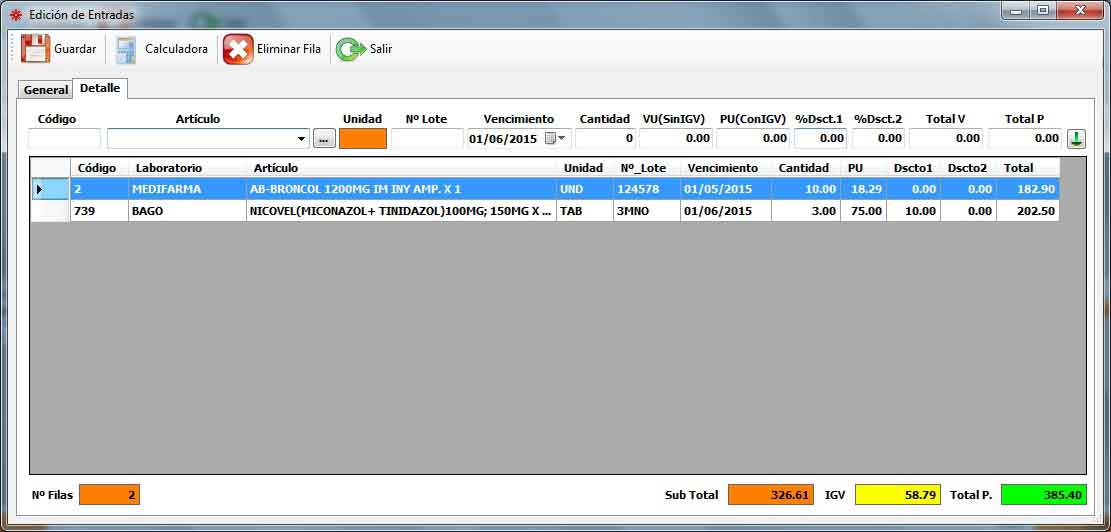 Esta ventana le permite registrar, en una sola operación, cantidades, precio de venta al público lotes y fecha de vencimientos. También